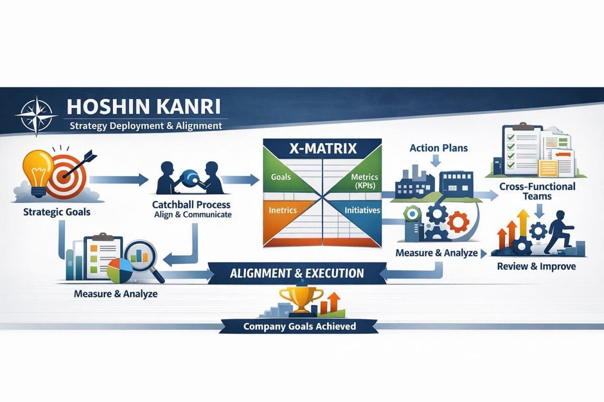 Hoshin Kanri is a strategic planning method that aligns organizational goals—from executive leadership to frontline staff—so everyone contributes to shared priorities and measurable outcomes.